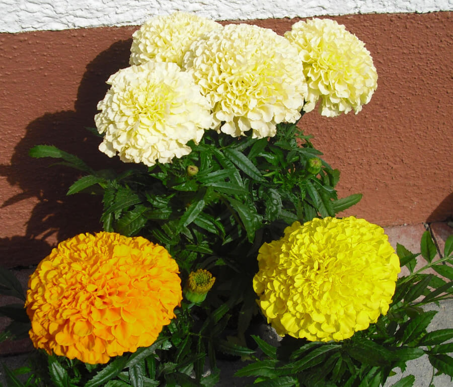 Es ist schon erstaunlich, welche Resultate Züchtungen manchmal hervorbringen. Zum Beispiel die neuartigen Tagessorten auf dem Foto. Den Pflanzenkundigen ist es tatsächlich gelungen, Blüten zu züchten, die doppelt so groß sind wie die Blüten einer normalen Tagetes. Waren es ursprünglich maximal 5 cm Durchmesser, so sind es jetzt sogar über 10 cm. Zudem haben die Blüten so viele Blätter, dass man die Pflanze schon fast mit einer Chrysantheme verwechseln könnte, nur dass jetzt die Blühzeit nicht stimmen würde. Auch das Laub ist ganz anders geformt. Geblieben ist der typische Geruch einer Tagetes, der für die Nase nicht unbedingt eine Wohltat sein muss, weshalb besonders ältere Leute zu diesen Blumen auch Stinkeblumen sagen.